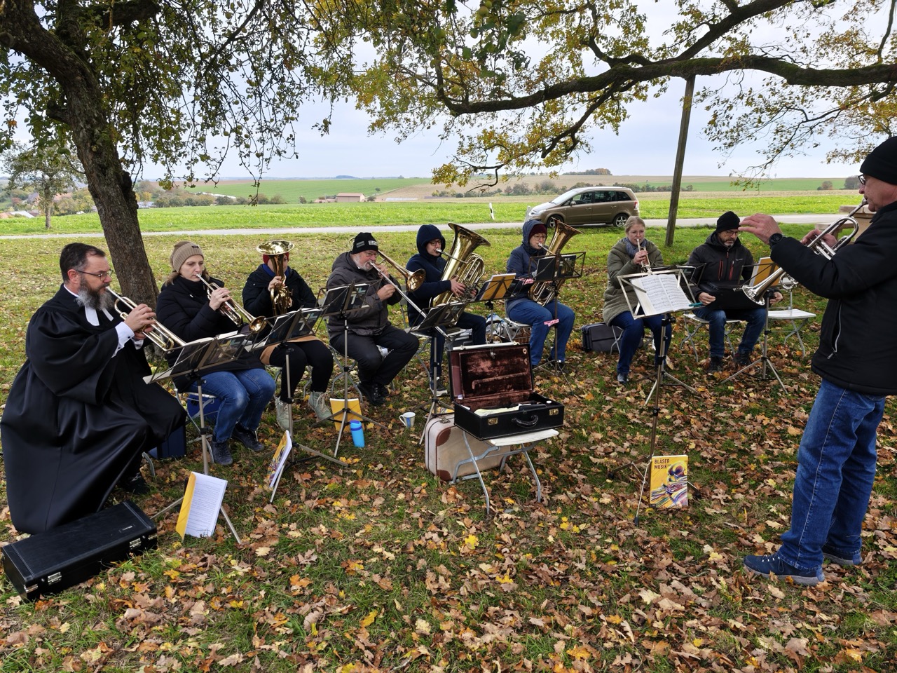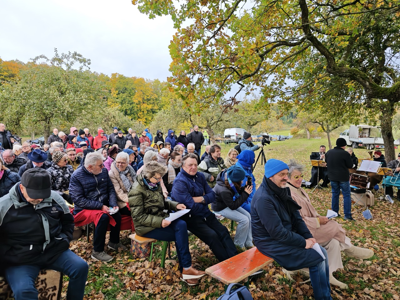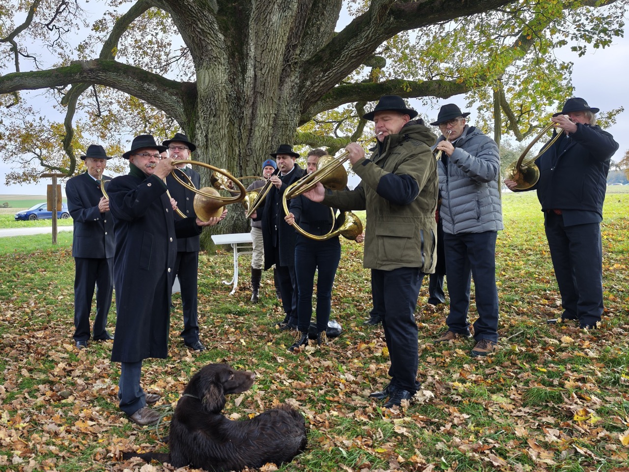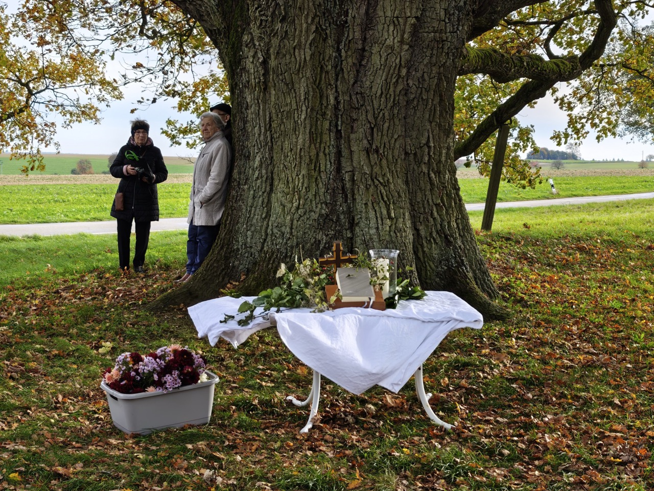Das alles war ein sehr emotionales Programm auf hohem Niveau. Die Kälte trat offenbar in den Hintergrund, denn es gab keinen nennenswerten Teilnehmerschwund. Die immer mal scheinende Sonne wärmte zwar nicht nennenswert, aber brachte die gelben Blätterfarben der Eiche am Baum und auf dem Boden zum Leuchten.