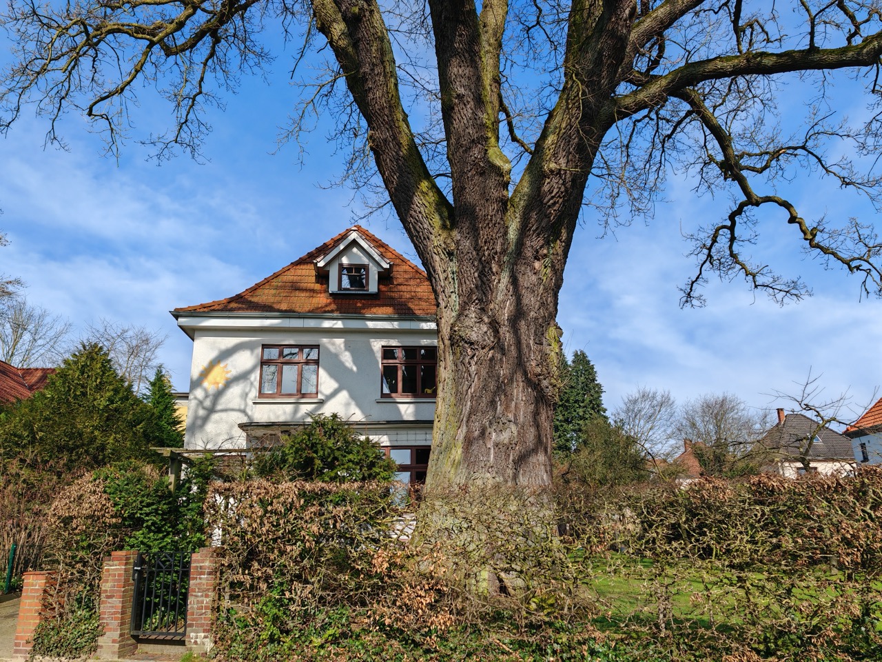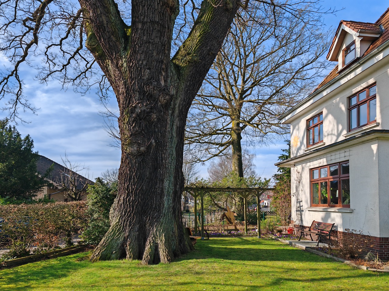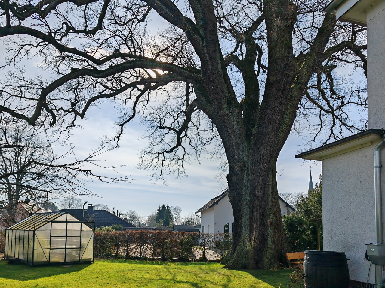 Dies dürfte die stärkste Eiche von Bremen sein, sie war aber bisher fast unbekannt! Und das wäre sie wohl auch geblieben, wenn der weitsichtige und baumfreundliche Eigentümer sie nicht selbst gemeldet hätte. Wir sind ihm dafür sehr dankbar, denn so kommt nun auch diese private Eiche in den Genuss der Beachtung und Förderung durch unsere Initiative und soll gerne 1000 Jahre in Würde alt werden. Es ist uns bewusst, dass dieses Ziel und Anliegen sehr, sehr mutig ist, aber wir wollen damit auch vorführen, dass sogar Privatbäume höchstrangigen Stellenwert unter den Uraltbäumen haben sollen oder erlangen können. Zudem stehen die bald 100 Nationalerbe-Bäume stellvertretend für alle alten Bäume in Deutschland, damit wir mehr für ihren Erhalt tun und nicht nur jammern, dass sie gefährlich wären oder im Weg stehen oder gelegentlich Blätter und Früchte herunterfallen.