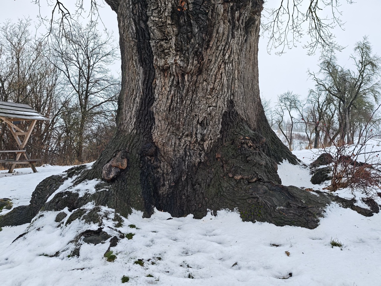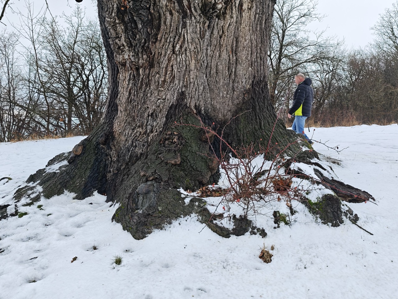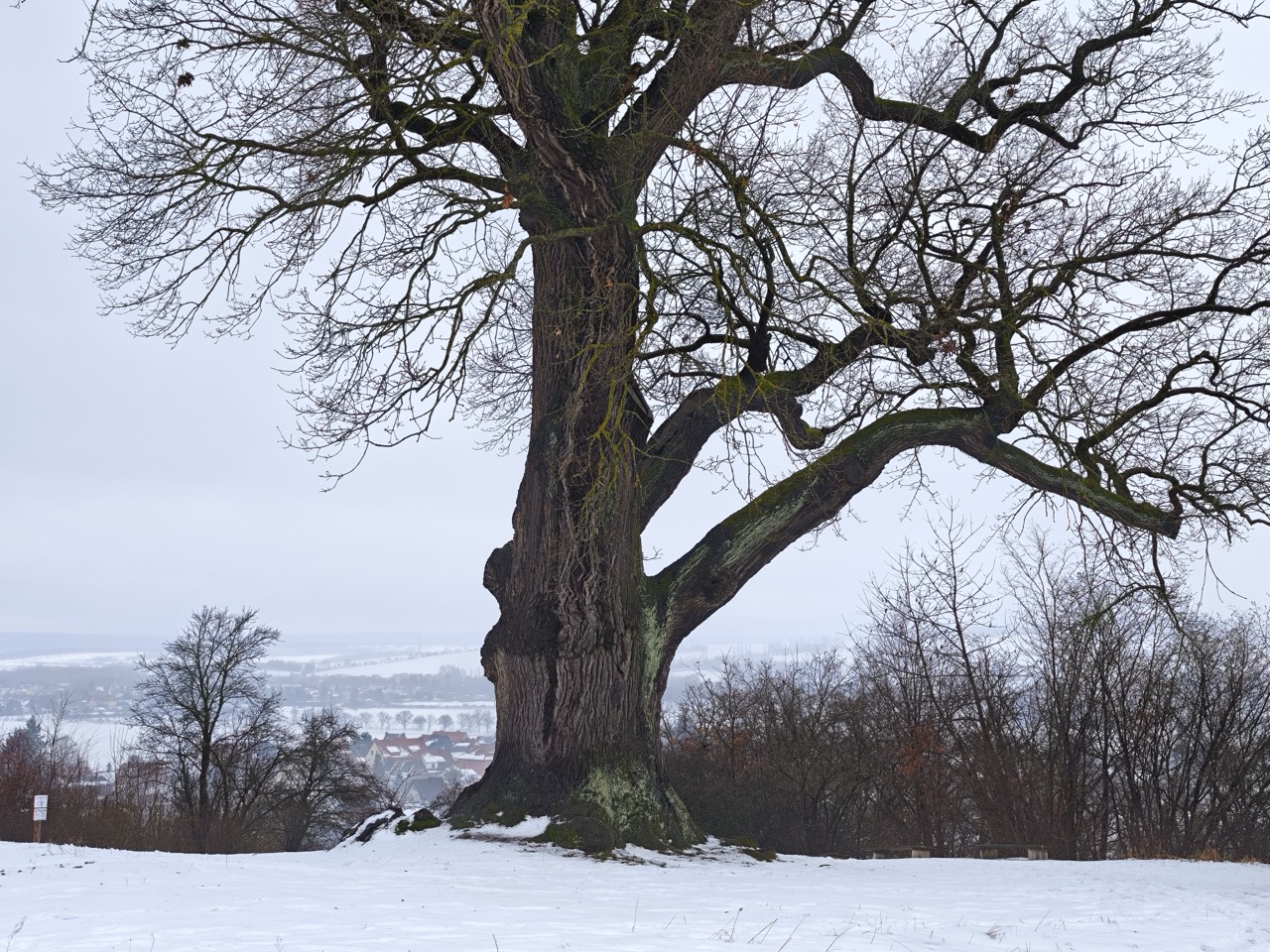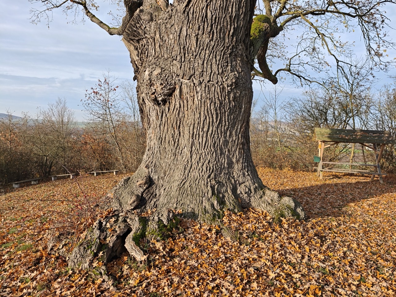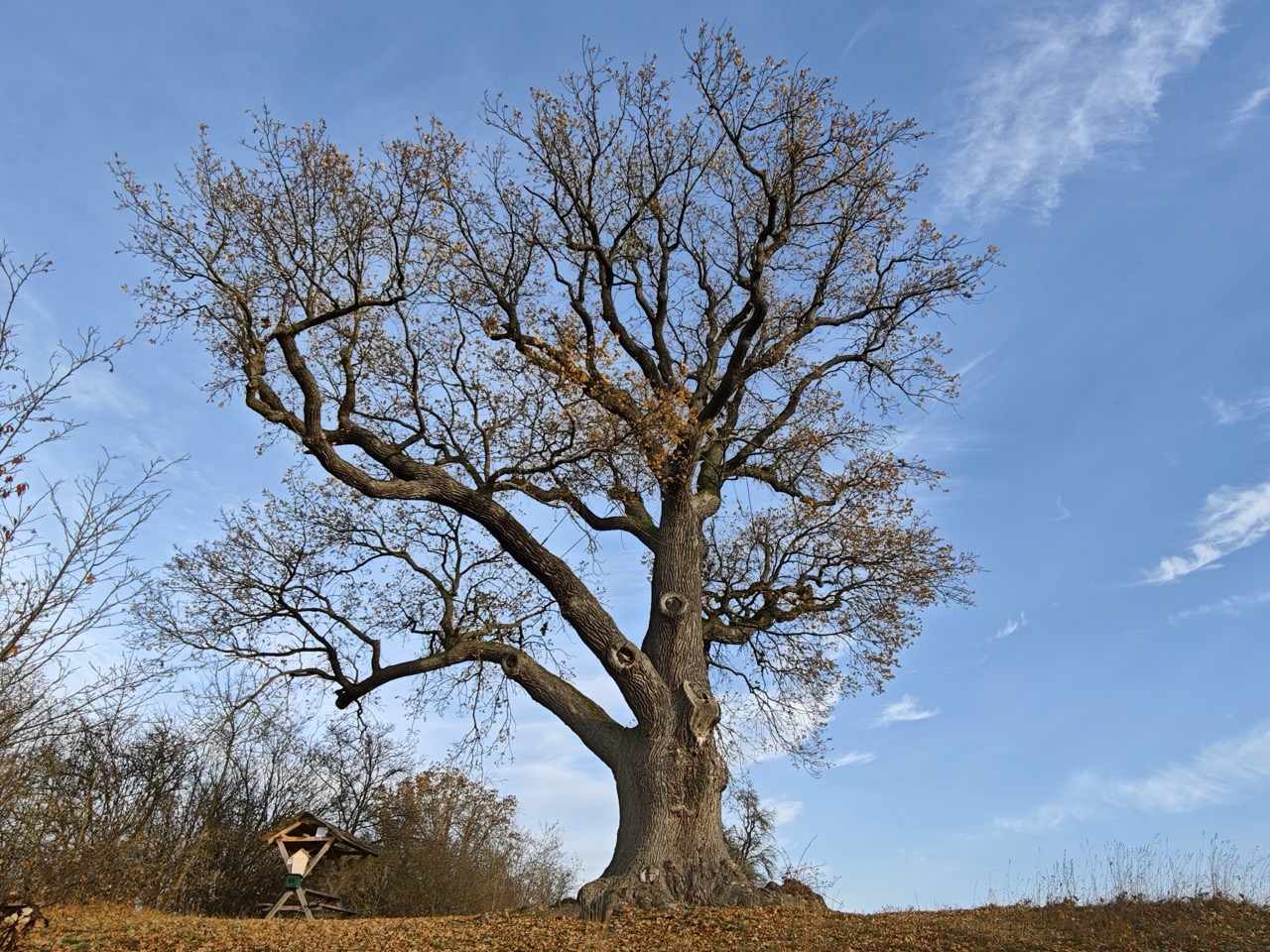 Die eindrucksvolle Eiche ist markantes Wahrzeichen vor den Toren der Stadt Nordhausen und wurde bereits dreimal vorgeschlagen, u.a. von der Stadt selbst. Sie steht sehr exponiert auf dem Höhenrücken und im Regenschatten des Harzes am Südharzer Karstgebiet (einer Trockenregion), so dass sie – noch dazu mit ihrem früheren Aufwuchs im Wald – einen deutlich geringeren Zuwachs gehabt haben dürfte als viele andere Eichen. Das ist bei der Alterseinschätzung zu berücksichtigen, so dass wir bei etwa 650 Jahren landen und damit also ihr Alter sogar höher einschätzen als viele andere. Eigentlich würde man dort eher eine Trauben-Eiche als eine Stiel-Eiche erwarten, unter dem Baum lagen im Herbst aber vor allem Stieleichen-Blätter, weniger Traubeneichen-Blätter. Das wird natürlich im kommenden Sommer nochmal gezielt überprüft.