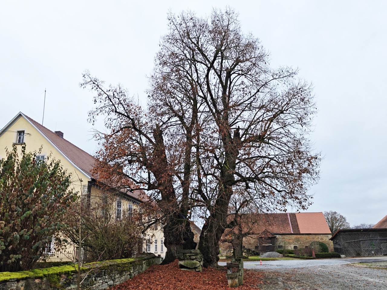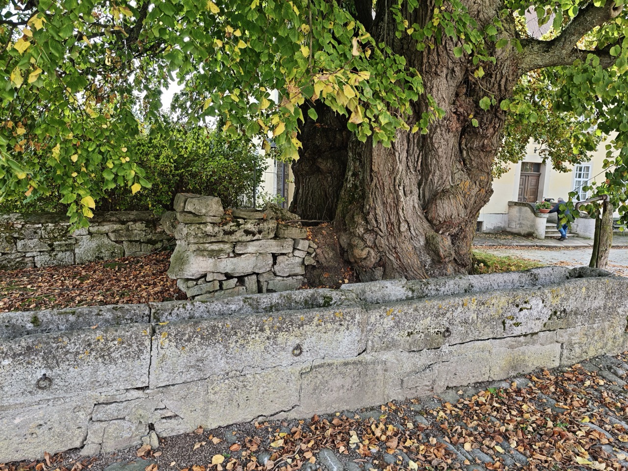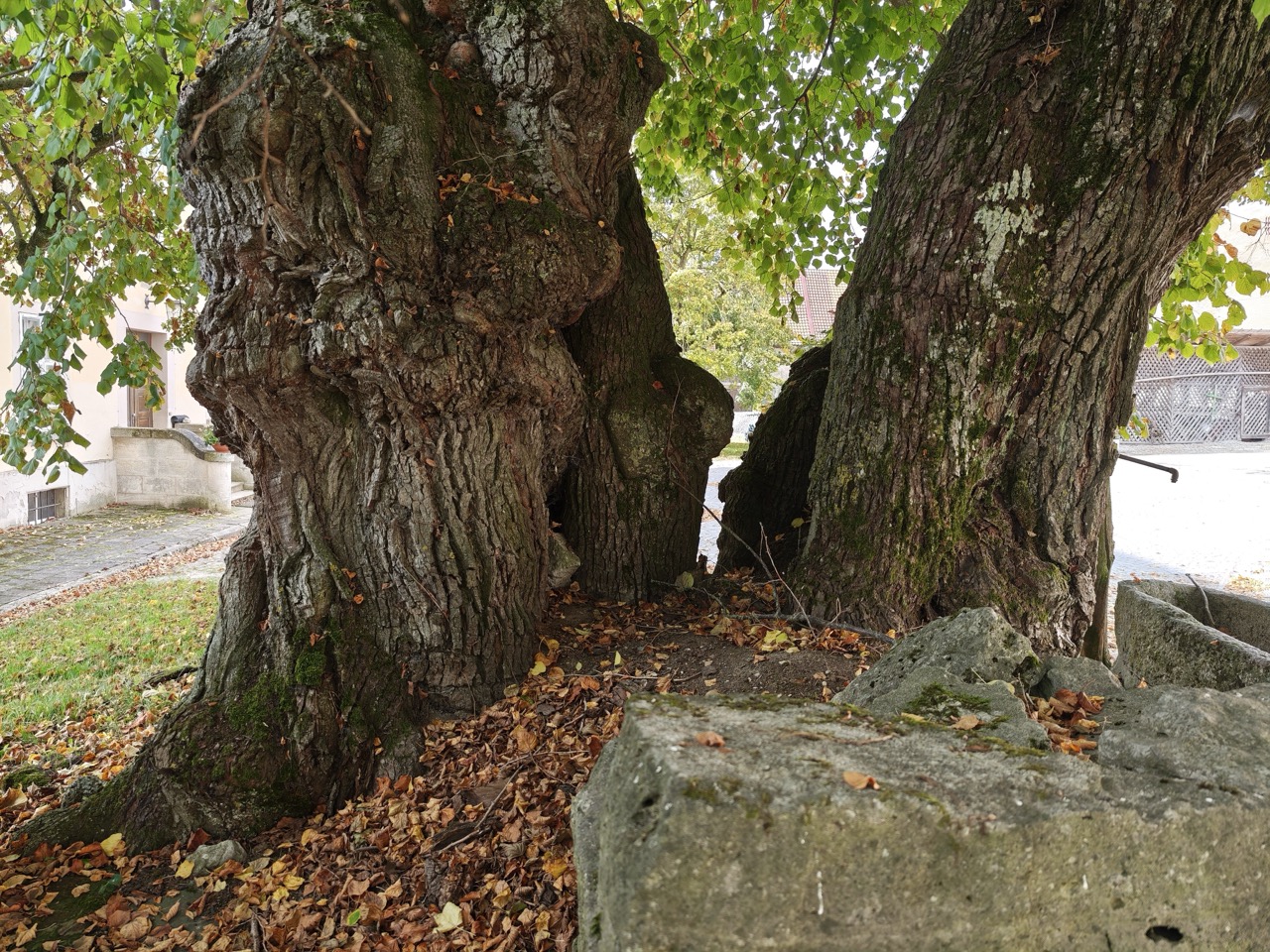 Zur Hoflinde Burgstall muss man dann aber wieder herausfahren aus dem Städtchen, etwa 5 km nach Südwesten (Richtung Blaufelden/Schwäbisch Hall, s. genaue Routenbeschreibung im Kasten). Dorthin wird es schnell immer einsamer, bis schließlich nur noch dieser Hof in der freien Landschaft mit Blick in die weite Ferne kommt. Die besondere Linde ist nicht zu übersehen im Hof des Gutes, und man kann nah an sie herantreten. Die Baumbesonderheit ist neben ihrer Hofbaum-Funktion und dem altertümlichen Umfeld ihr dicker Stamm mit fast 9 m Umfang und die mächtige Krone. Der Stamm besteht aus zwei Stammteilen, die zusammengehörig sind, was man an ihrer beider halbringförmigen Gestalt erkennt. Wie öfters bei so alten Bäumen sieht man diesem Baumveteran an, dass er schon viel erlebt hat: die beiden Stammfußhälften haben wilde Strukturen mit gewaltigen Innenwurzel-Stämmen. Von der Krone sind immer wieder Teile abgebrochen (meist bei Sturm und Gewittern) und mussten regeneriert werden, was für Linden aber i.d.R. kein Problem darstellt. Hier wird ein junges engagiertes Arboristen-Team aktiv werden und sich um den Baum kümmern.