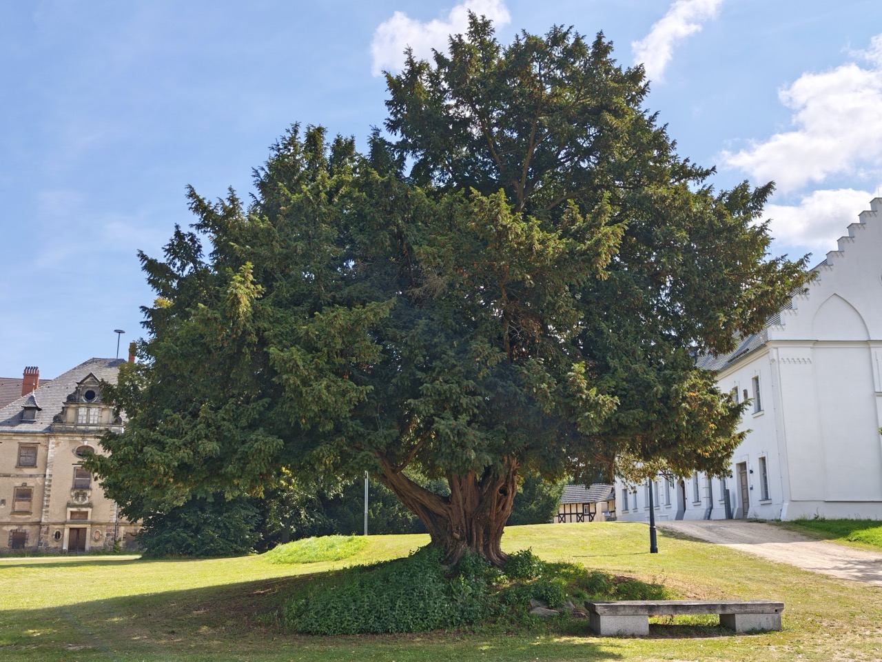 Das nette Städtchen Baruth in der sog. Mark Brandenburg hat einige Sehenswürdigkeiten, aber die Schlosseibe war bisher noch weitgehend unbekannt geblieben. Eine Beschreibung in der Baum-Zeitschrift ‚Der Eibenfreund‘ (Jahrgang 2022, Download über Google möglich) vom Dendrologen und Baumkenner Andreas Gomolka hatte mich auf sie aufmerksam gemacht, und ich hatte diese Eibe seitdem in „Wartestellung“. Denn er schrieb in seinem Artikel über bemerkenswerte Eiben in Brandenburg (S. 59): „Diese Eibe habe ich aufgenommen, weil ich sie außergewöhnlich schön finde.“ Der Satz hat es mir damals beim Lesen angetan.