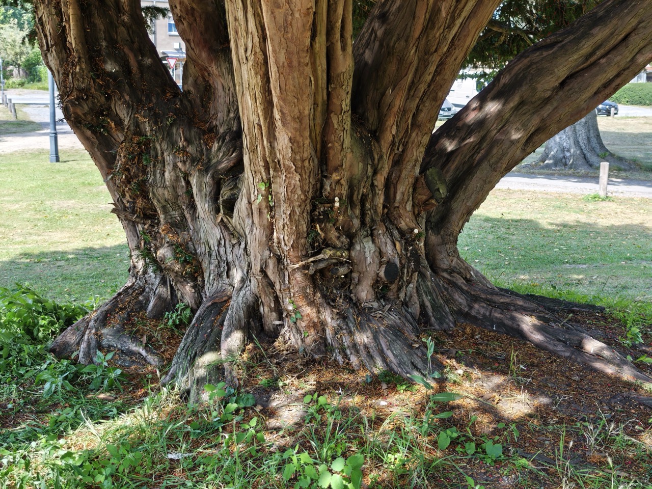 Die Taille des wulstigen Stammes befindet sich in 0,6 m Stammhöhe, darüber teilt er sich in zahlreiche Stämmlinge auf. Der dadurch kurze imposante Stamm mit noch erhaltenen Teilen vom Ursprungsbaum ist aber absolut prägend für den Baum und seine Wirkung wie bei etlichen Methusalem-Eiben in England mit einem Alter von dort 1000 und mehr Jahren.