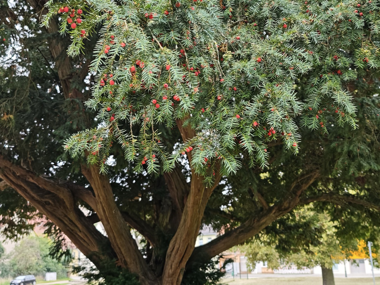 Und als ich im Juli 2025 auf einer Baum-Suchtour durch die südliche Mark Brandenburg dort vorbeikam, stand sie mit weiteren 5 Kandidaten im Programm und dann seitdem als Kandidat für unsere Nationalerbe-Bäume in dieser Region fest. Bereits kurz danach kam ein Ortstermin beim Bürgermeister der Stadt zustande, und er hatte zur Besprechung schon den unterschriebenen Vertrag vorbereitet (so liebe ich das!). Denn er war so überwältigt von unserem Vorhaben und die Stadt empfindet es als große Ehre, dass wir ihre Eibe ausgewählt haben.